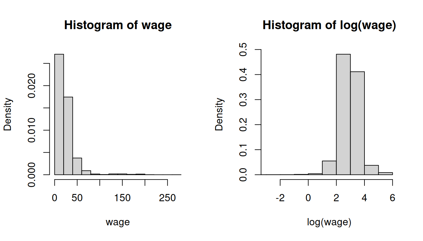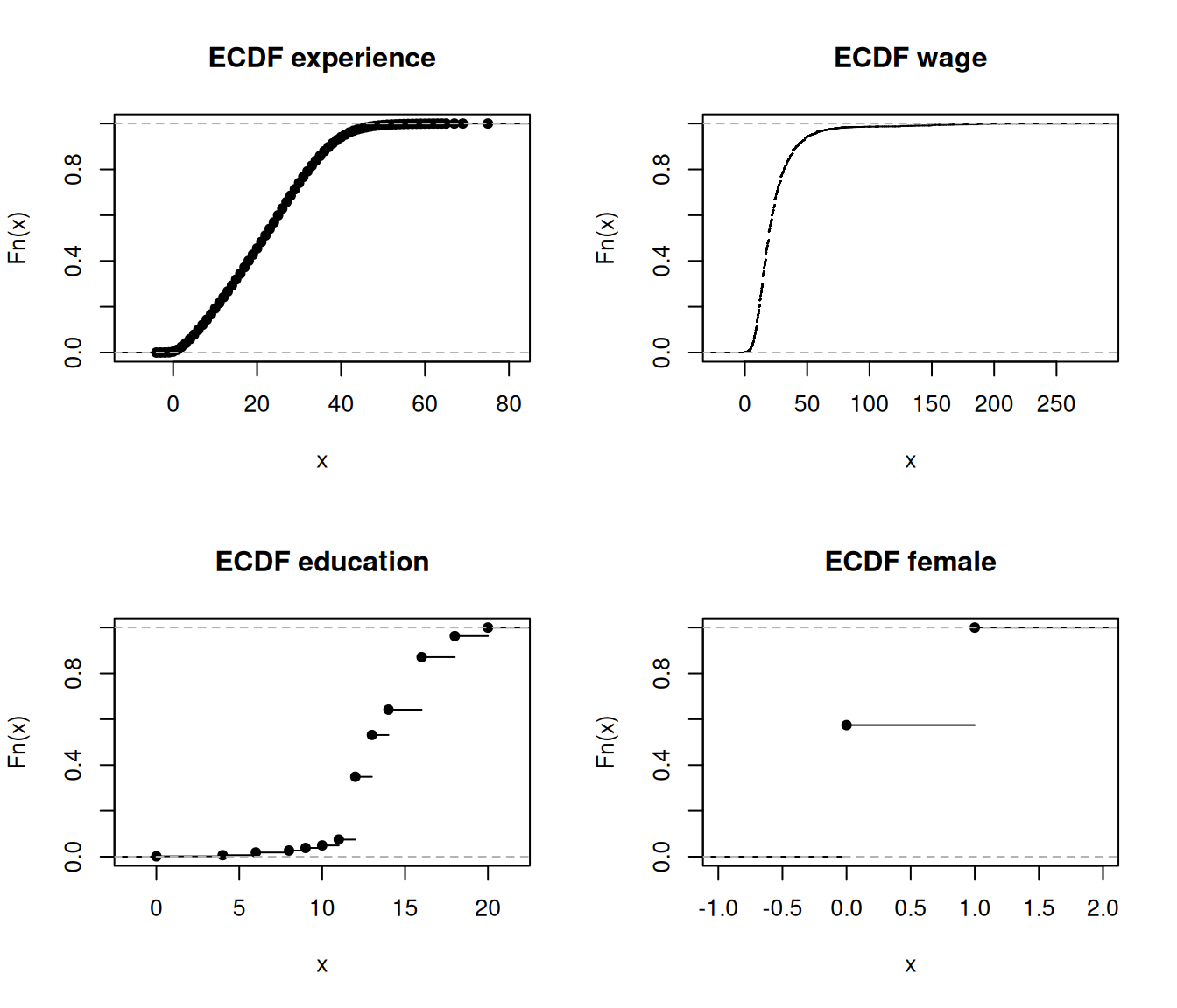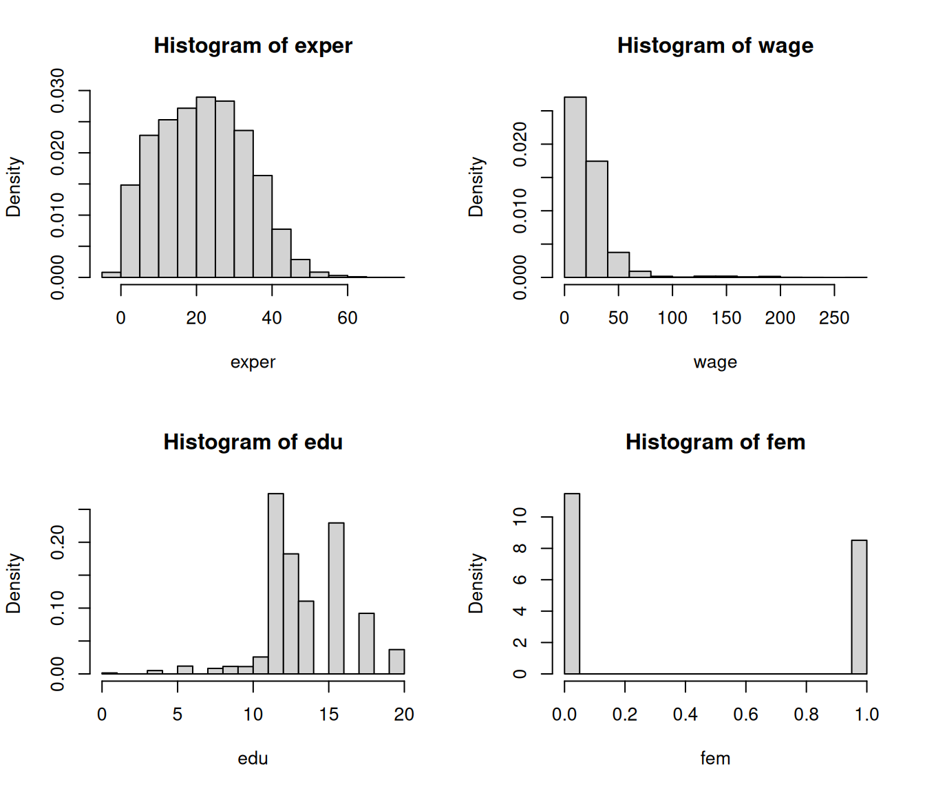 The plots show that edu and fem are discrete variables. The variable exper, although measured in years and technically discrete, has a large number of possible values, which makes it effectively “almost” continuous. On the other hand, the variable wage is clearly continuous, as it can take on a wide range of values.