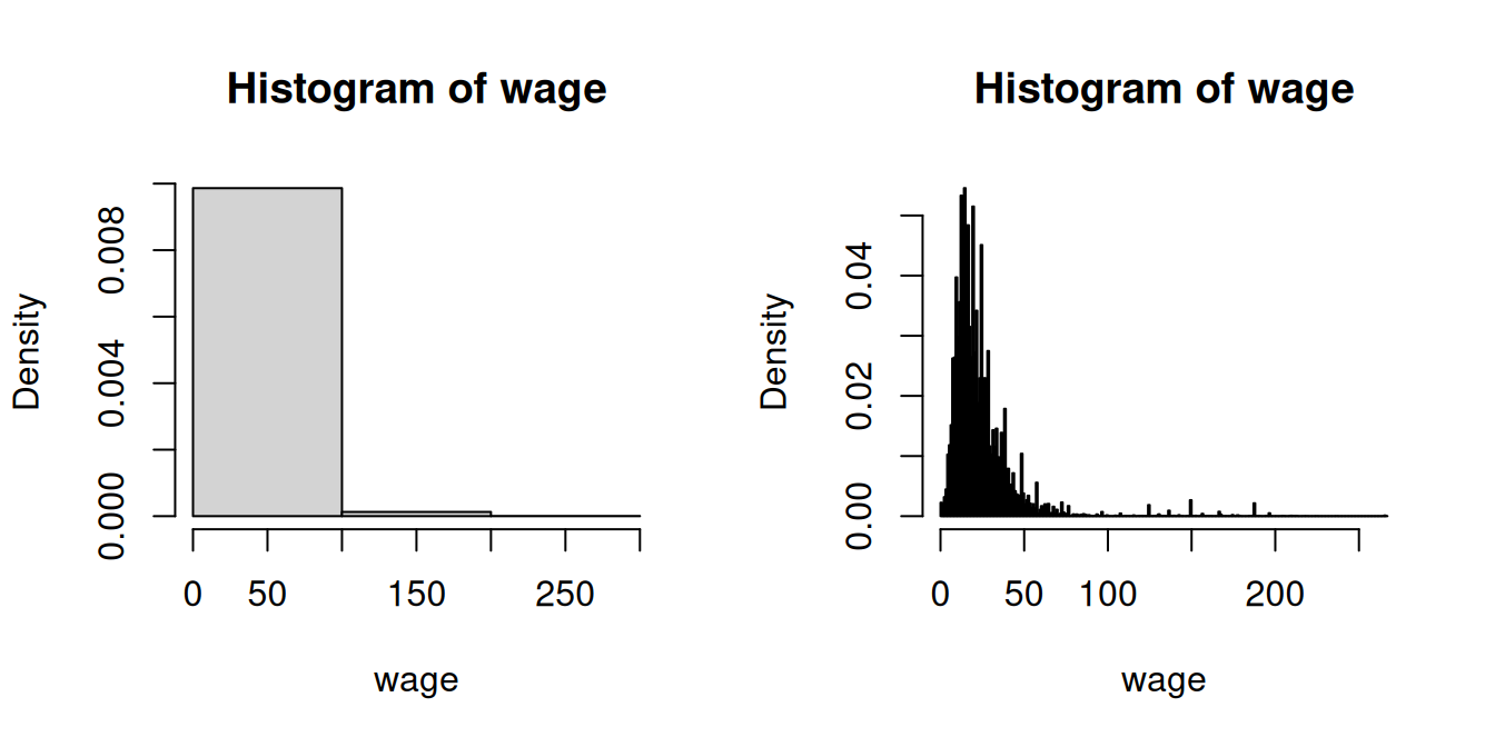 Running hist(wage, probability=TRUE) automatically selects a suitable number of bins B. Note that hist(wage) will plot absolute frequencies instead of relative ones. The shape of a histogram depends on the choice of B. You can experiment with different values using the breaks option: