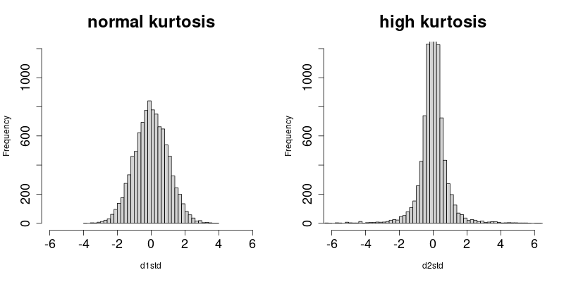 The plot shows histrograms of two standardized univariate datasets (i.e., their sample mean is 0 and their sample variance is 1). The dataset from the left plot has a normal sample kurtosis (around 3) and the dataset from the right plot has a high sample kurtosis with more obervarions in the tails.