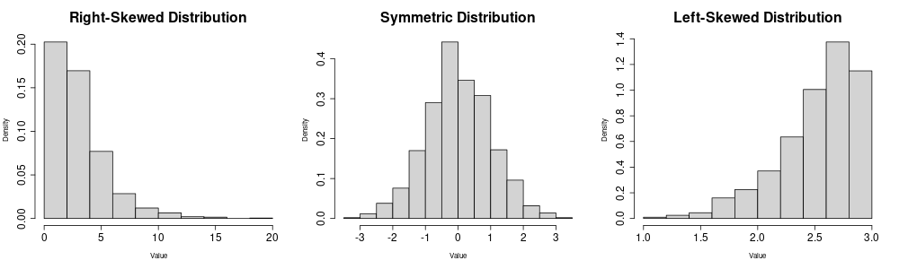 For example, the third standardized sample moment (r=3) is the sample skewness: \widehat{skew} = \frac{1}{n \widehat \sigma_Y^3} \sum_{i=1}^n (Y_i - \overline Y)^3. The skewness is a measure of asymmetry around the mean. A non-zero skewness indicates an asymmetric distribution, with positive values indicating a right tail and negative values a left tail.